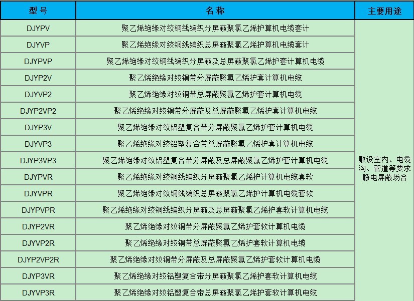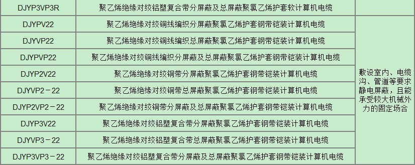 本產品適用于額定電壓500V及以下對于防干擾性要求較高的電子計算機和自動化連接用電纜。